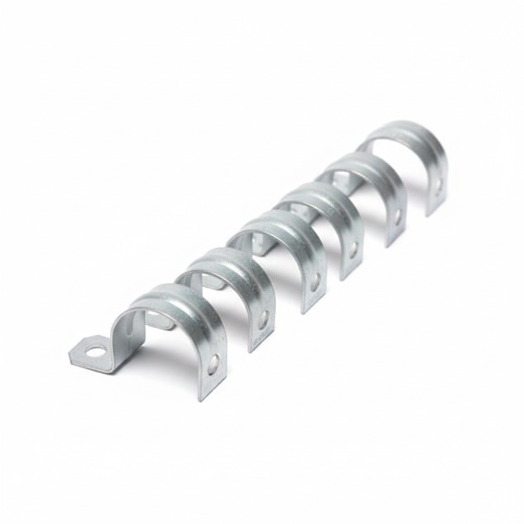 Abrazadera tipo uña cromada marca Jamik, diseñada para fijación segura de tubería en instalaciones de plomería y ferretería. Su acabado cromado brinda mayor resistencia a la corrosión.
