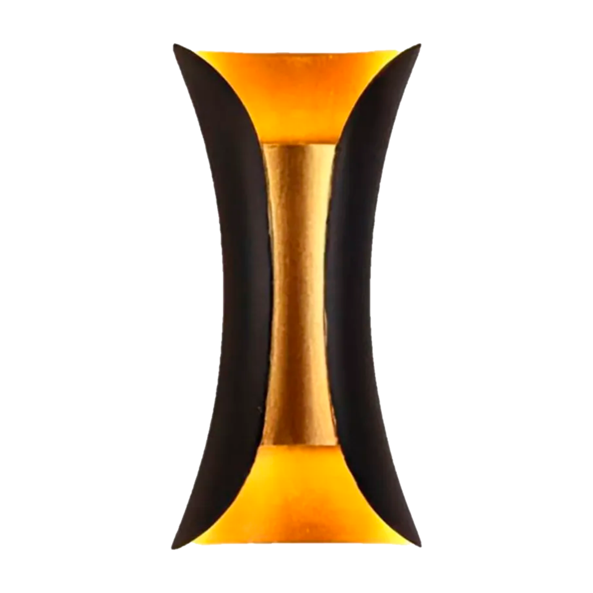 Elegante lámpara de pared con acabado Negro-Dorado. Su diseño moderno es ideal para resaltar texturas en muros y crear ambientes acogedores.